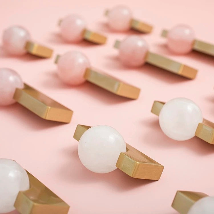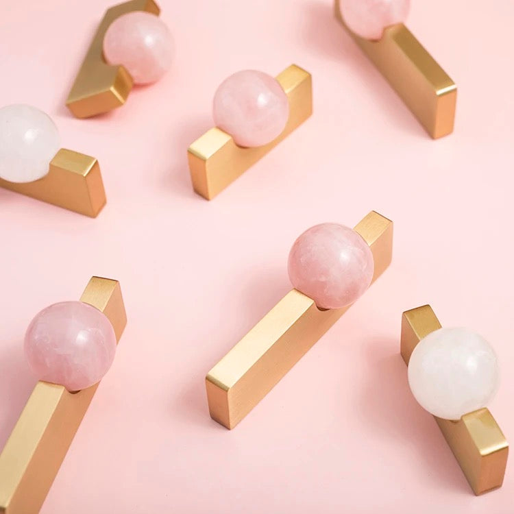 Stylish brass handle with round stone. Comes in several different sizes and designs. Fits nicely on wardrobes and chests of drawers.